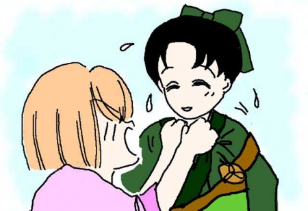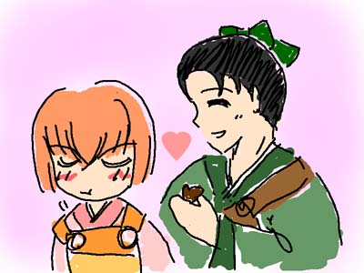 「いや、だから何度も言ってるように、あくまでもフィクションだって」 「どうみても、オレとおまえではないかっ! というか名前も出てたぞっ」 「そうだっけ? まあ、ちょっと落ち着いてチョコでもどうだい」 「いらんわッ」 「そう言わないで、せっかく君のために買ってきたんだから」 「……おまえ、東皇使としてそれはどうなんだ」 「たまにはいいじゃないかね。はい、あーん」 「!!」 |